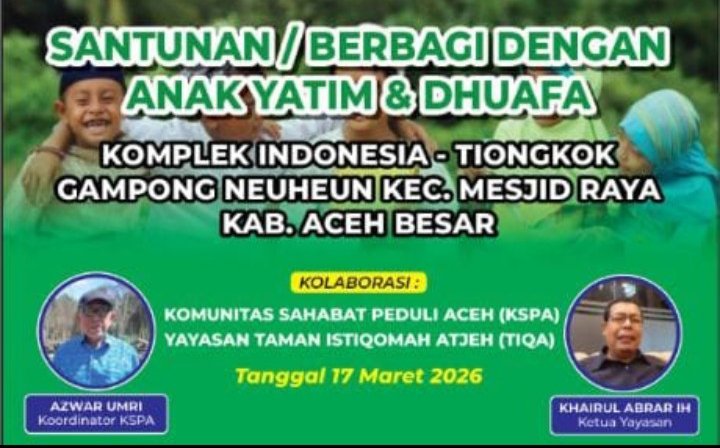 Aceh Besar, medialahzan id – Suasana penuh kehangatan mewarnai kegiatan santunan anak yatim dan dhuafa yang digelar Komunitas Sahabat Peduli Aceh (KSPA) bersama Yayasan Taman Istiqomah Atjeh (TIQA) di Komplek Indonesia Tiongkok, Gampong Neuheun, Kecamatan Mesjid Raya, Aceh Besar, Selasa (17/3/2026).
