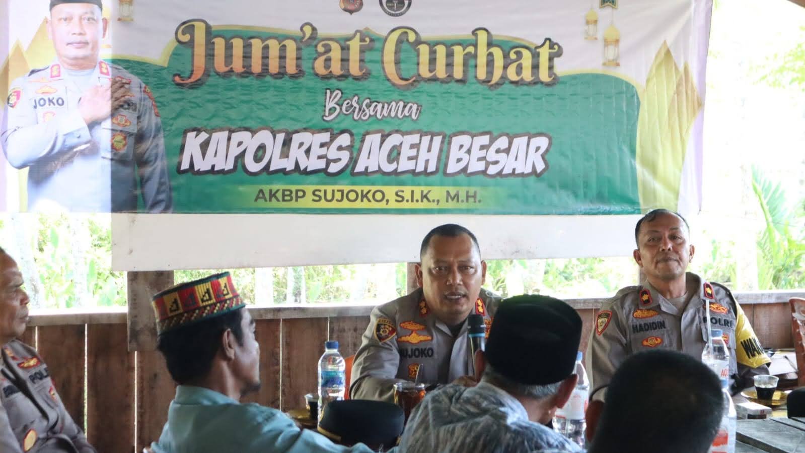 Kapolres Aceh Besar AKBP Sujoko S.I.K.,M.H., dalam sambutannya menyampaikan bahwa kegiatan Jumat Curhat ini merupakan prioritas polri dalam menampung segala aspirasi, permasalahan dan keluhan masyarakat serta gangguan kamtibmas yang terjadi.