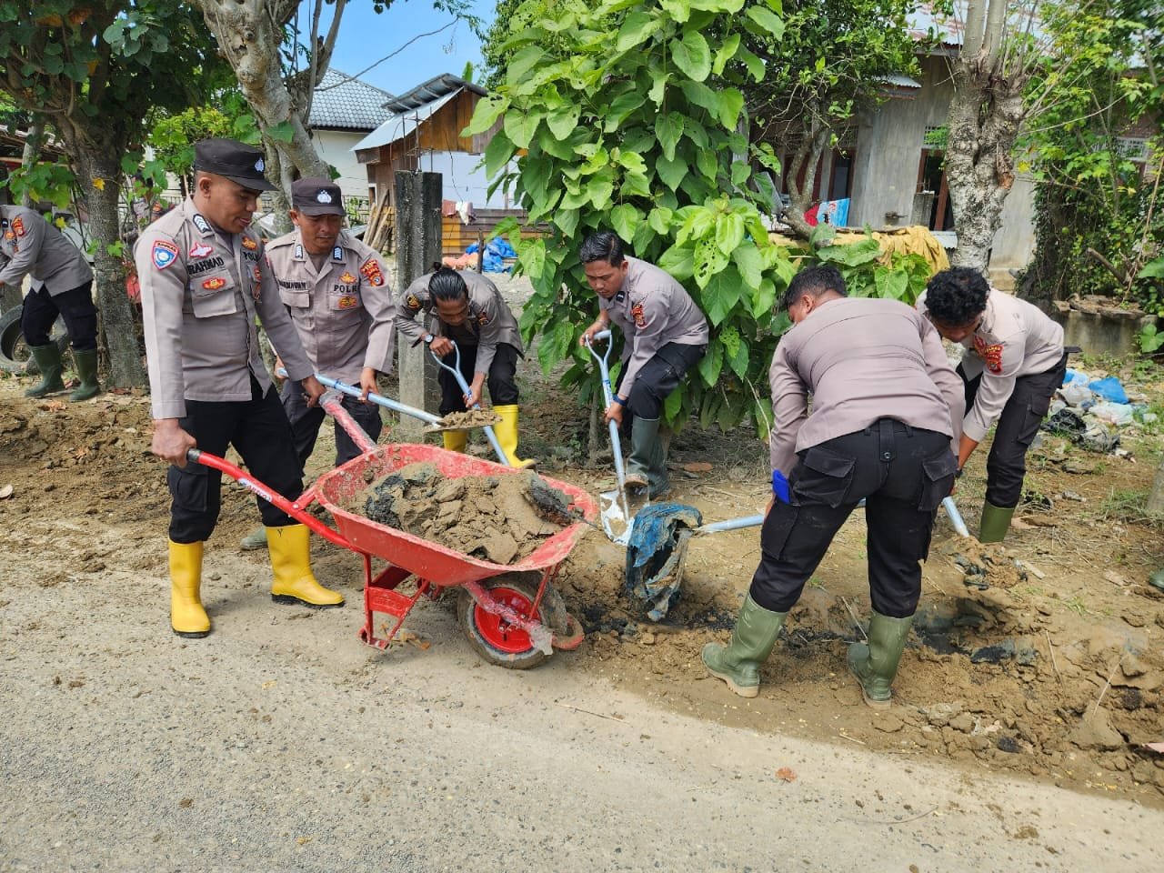 Dengan menggunakan peralatan manual seperti sekop, cangkul, dan gerobak dorong, personel Polres Pidie bergotong royong membersihkan sisa lumpur agar akses jalan kembali bersih, aman, dan nyaman dilalui masyarakat.