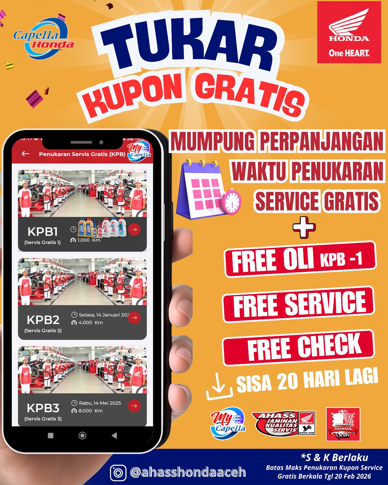 Program ini memberikan kesempatan tambahan bagi konsumen yang belum sempat menukarkan Kupon Perawatan Berkala (KPB) agar tetap dapat menikmati servis gratis dan oli gratis di jaringan AHASS (Astra Honda Authorized Service Station) atau Bengkel Resmi Honda.
