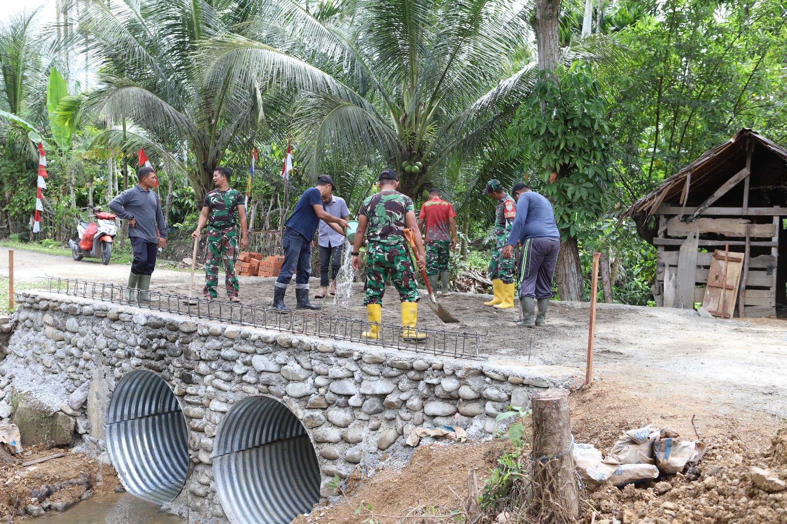 Kegiatan ini dilakukan dengan penuh semangat gotong royong, mencerminkan sinergi yang kuat antara TNI dan masyarakat dalam mendukung pembangunan infrastruktur di wilayah tersebut.