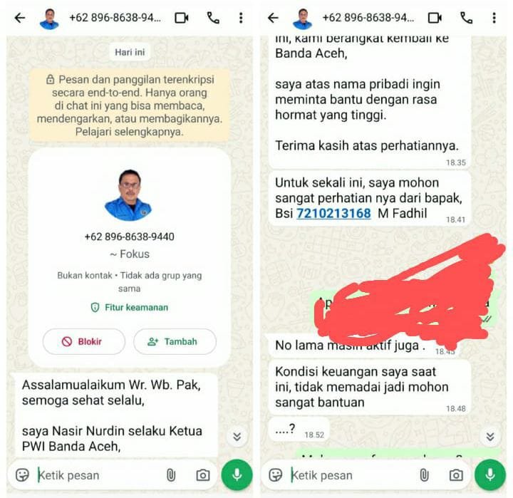 Berdasarkan tangkapan layar percakapan yang beredar di Whattsup, pelaku menggunakan foto profil Nasir Nurdin Ketua PWI Aceh ,Oknum tersebut mengunakan nomor WhatsApp +62 896-8638-9440, dan menyisipkan Nomor Rekening 7210213168 Bank Syariah Indonesia dengan nama M.Fadhil dan oknum tersebut menyampaikan kepada seorang ASN disalah satu istansi di Provinsi Aceh